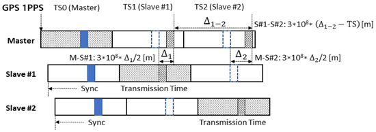 Fourth, the ranging process involves the master measuring the time difference between the transmission and detection of the synchronization signals for each slave. For example, the distance between the master and slave 1 (S#1) is calculated as [31,32]