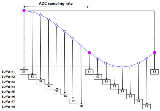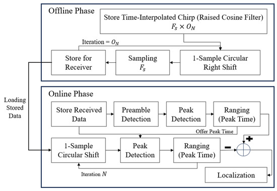 The first step of the offline phase is storing time-interpolated chirp signals, which is the core concept of the proposed scheme. In the first step, the chirp signal with raised cosine interpolation is applied to enhance the time resolution by increasing the number of samples according to the oversampling rate [41,42]. Then, the one-sample circular shift technique is used to generate high-resolution time-delay states by cyclically shifting the oversampled signal at a certain time [43]. However, the system has to use the ADC sampling rate for ranging, and the sampling step samples the oversampled signal by the ADC sampling rate and stores the buffers by the number of the oversamples. These steps result in oversampling-like effects, even though the system is at the same sampling rate as the ADC’s and ensures finely tuned signals, enabling precise peak detection in the later stages. Figure 9 illustrates an example for sampling in the offline phase, as explained above.