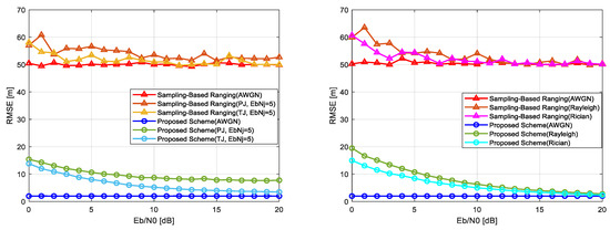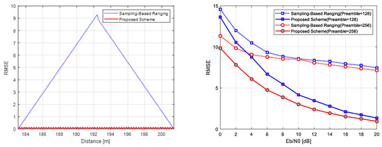 Under an ideal no-noise case, the conventional sampling-based ranging scheme demonstrates positioning errors up to 9 m, caused by mismatches between the sampling interval and propagation delay [54,55]. As mentioned earlier, in order to improve the ranging accuracy, UWB, which is a representative scheme of sampling-based ranging, is considered [6,7]. However, since UWB needs a GHz-based sampling rate, the localization system must be equipped with more expensive ADC chipsets to ensure the localization accuracy. The proposed scheme addresses this issue using raised cosine filtering for time-domain interpolation, significantly enhancing time resolution and mitigating these mismatches. Please note that the proposed scheme obtains the localization accuracy the same way as a high-speed ADC sampling rate even though it is in a low-speed sampling rate. This is the reason that the chirp signal changes the instantaneous frequency according to time for spreading the signal bandwidth, and the ranging resolution can be improved by not only a time–frequency product, known as processing gain, but also time-interpolated chirp signals, which can extract a sample more sensitively. In order to improve the ranging resolution for the proposed scheme more accurately, the time–frequency product should be more increased, and the time-interpolated chirp signals should be more oversampled. Since the proposed scheme spreads the spectrum from 8 kHz to 1 MHz and uses time-interpolated chirp signals, the processing gain is obtained as 125 times better, and the ranging resolution is guaranteed at an RMSE level of below 1 m even though the chirp bandwidth is 1 MHz. As shown in Figure 10 (left), the proposed scheme achieves consistently lower errors than the conventional approach.