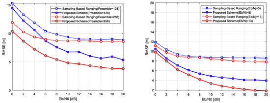 In the AWGN channel, both schemes utilize Zadoff–Chu sequence preambles of lengths 128 and 256. The proposed scheme leverages the CSS processing gain and Zadoff–Chu correlation properties to achieve a 5 dB improvement in ranging accuracy over the conventional scheme with a sequence length of 256. Additionally, at higher levels, the proposed scheme delivers an extra 6.5 dB improvement, showcasing robustness in noisy environments, as seen in Figure 10 (right).