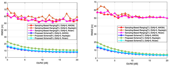 Under combined jamming and fading conditions, the conventional scheme suffers from significant localization errors. In pulse jamming combined with fading, errors range from 50 to 75 m at low levels, with negligible improvement as increases. Similarly, in tone jamming combined with fading, errors range from 55 to 65 m. The proposed scheme, however, demonstrates robust performance even in these challenging conditions. Under pulse jamming with Rayleigh fading, errors are reduced to approximately 25 m at low levels and further decrease to within 15 m at higher levels. With Rician fading, errors improve from 20 m to within 10 m, as shown in Figure 13 (left). Similarly, under tone jamming with Rayleigh fading, errors decrease from 20 m to within 5 m, and with Rician fading, they improve from 15 m to within 5 m at higher levels, as illustrated in Figure 13 (right).