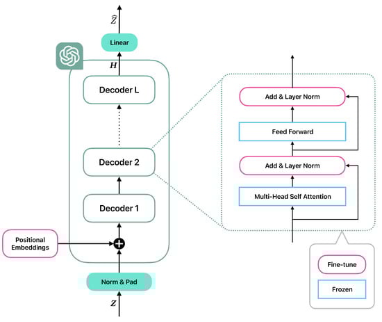 Given that GPT-2 was originally developed for the NLP domain, with the objective of adapting its pre-trained parameters for MTAD tasks, its multi-head self-attention layers and feed-forward neural networks are chosen to be frozen, thereby preserving prior knowledge. Furthermore, only the positional embeddings layer and normalization layers are fine tuned, in accordance with the approach outlined in [26]. The detailed structure of GPT-2 is shown in Figure 2.