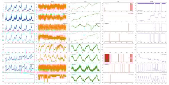 In order to demonstrate the efficacy of the proposed AD method, experiments were conducted on five publicly available datasets. These time sequences originated from diverse real-world scenarios, encompassing internet servers (SMD), industrial sensors (SKAB), the public service domain (PSM), the space exploration field (MSL), and industrial control systems (SWaT). The detailed information related to these data sets is described as follows, and the statistics and examples of these datasets are displayed in Table 2 and Figure 3: