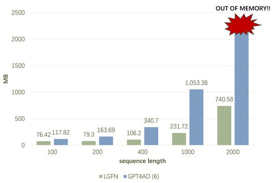 The GPT4AD(L) is comprised of two principal components: GPT-2 with L transformer decoders and a linear projection layer. In order to facilitate a more effective comparison of the spatial efficiency of the two models by controlling variables, it is necessary to set the length of the time series data processed by GPT-2 inside GPT4AD(L) in one batch equals , and the embedding dimension to be , both of which are the same as LGFN. It is evident that these transformer layers constitute the predominant component of in Equation (16), calculated as follows.