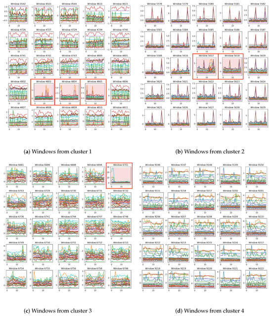 Figure 7 shows windows corresponding to parts of features from four different clusters of the SMD test set, with anomalous time points highlighted in red and enclosed with red boxes. In one window, different MTS channels are distinguished using different colours. From this figure, the following two phenomena can be summarized: