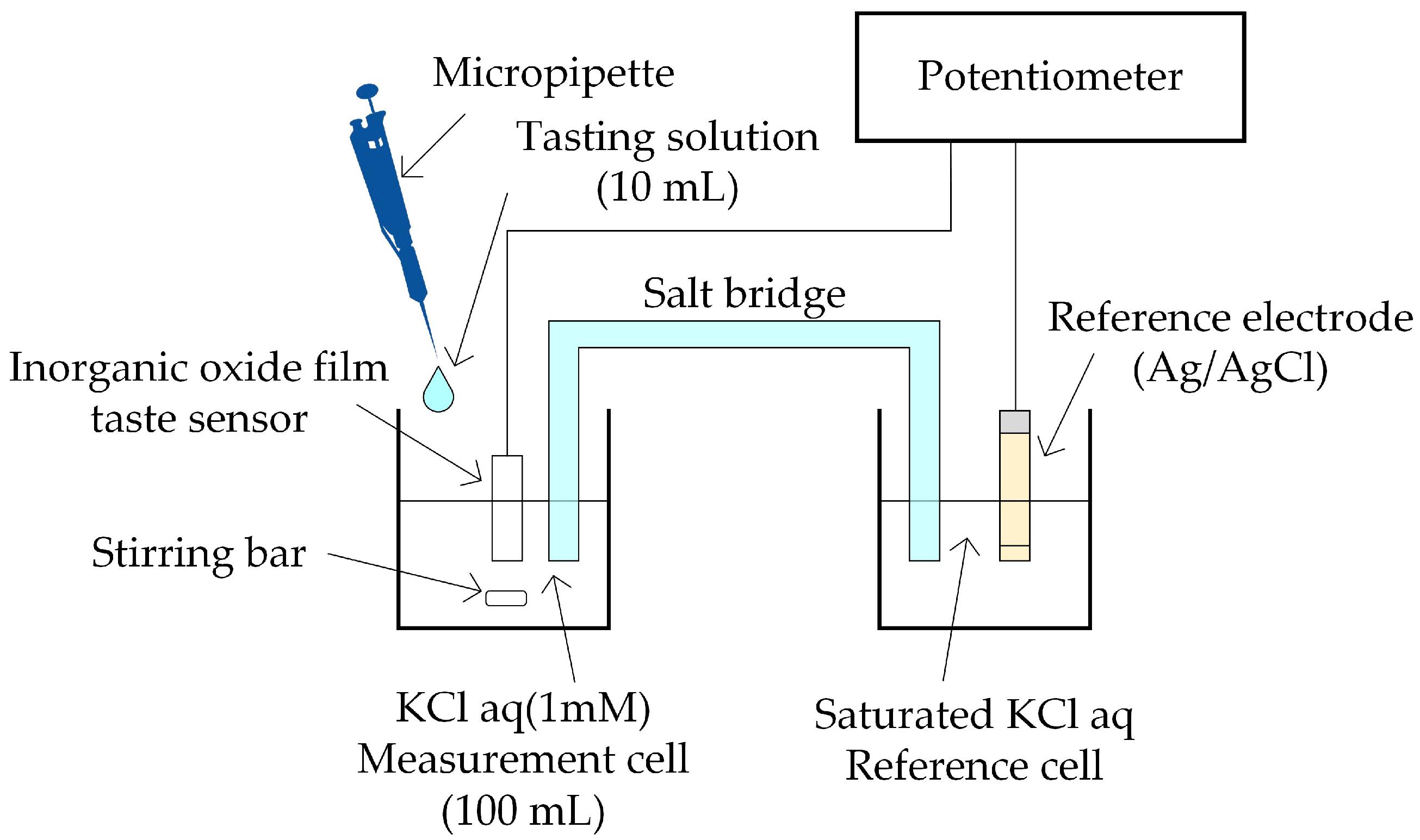 - Tamura, Y.; Uchida, H.; Hasegawa, Y. Study on Inorganic Film Taste Sensor for Hot Drink Evaluation. IEEJ Trans. Sens. Micromach. 2016, 136, 180–185. (In Japanese) [Google Scholar] [CrossRef]