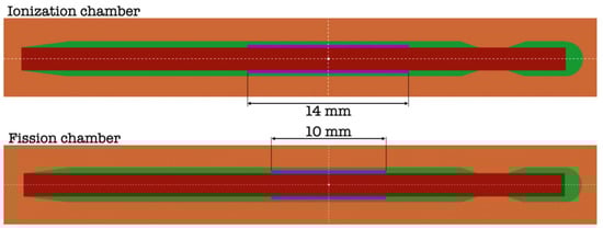 To a better understanding of the experimental results, a series of Monte Carlo simulations have been performed using the code PENELOPE [26]. The geometries of the chambers are outlined in Figure 3. They have been built up according to the technical information available (Photonis, Mérignac, France). Both have a very similar shape, the only differences occurring in the active volume (in violet in the figure), which is filled with Ar (or Ar and 4% N2). In the case of the ionization chamber, it has a length of 14 mm, while in the case of the fission chamber, it has 10 mm. In both cases, the active volume has a thickness of 0.25 mm. The central anode (in dark red in Figure 3) has a radius of 1 mm, and it is made of steel. In the case of the fission chamber, it is coated with 8 μm layer of U. The radius of the overall envelope is 1.5 mm and is made of steel (in green in Figure 3). Actual gas compositions and pressures have been included in the filling gas for the simulations. Additional simulations have been completed by simplifying the geometry of the chambers, leaving just the region of the active volume. In this way, the possible effects due to the elements external to the area of the active volume of the chambers have been eliminated.