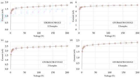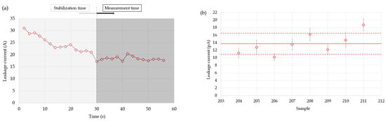 The leakage current obtained with each sample is shown in Figure 4b, with the average represented by a solid line and the ±1 SD range indicated by dashed lines. The average was 14.2 0.9 pA, with a maximum value of 18.7 1.3 pA, so the setup can be considered suitable for measuring the induced current with high accuracy and low noise level arising from the connections. This is consistent with the data provided by the manufacturer, which guarantees a leakage current of less than 150 pA for their detectors.