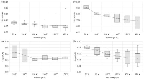 Slope of each detector model with different bias voltages: (a) micro-ionization chambers CRGR10/C5B/UG2, (b) micro-fission chambers CFUR44/C5B-U8/UG2, (c) micro-fission chambers CFUR43/C5B-U5/UG2, and (d) micro-fission chambers CFUR43/C5B-U8/UG2.