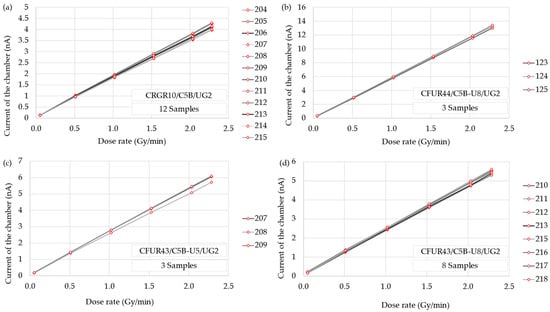 Response of every sample of each detector model to different dose rates of the X-ray tube: (a) CRGR10/C5B/UG2, (b) CFUR44/C5B-U8/UG2, (c) CFUR43/C5B-U5/UG2, and (d) CFUR43/C5B-U8/UG2.