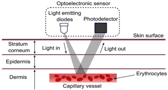 In transmission mode, a PPG sensor allows LED light to traverse absorbent materials, including bone, arterial and venous blood, and skin pigmentation. The detector then receives the light and quantifies it using filters and converters. Conversely, a PPG sensor operating in a reflection course reflects the fluorescent light emitted by an LED onto the skin. This light is then tracked by the detector and measured using filters and converters in a similar manner []. The operational mechanism of the sensor relies on the emission of infrared radiation with an LED that can efficiently pass through the skin and blood vessels []. The detector captures this light to quantify the blood flow, as visualized in Figure 1.