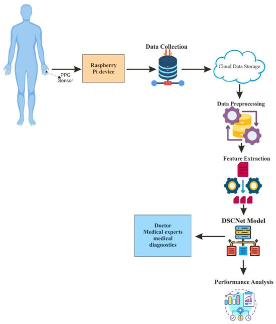 This research proposes a DL-model to monitor the BGL using PPG. The proposed approach is specifically developed to provide a non-invasive, precise, painless, and highly accurate solution. The research model’s architecture is depicted in Figure 2. The hardware module, along with a PPG sensor and Raspberry Pi computer, is specifically built to gather data from multiple patients. A PPG sensor is utilized to obtain PPG signals from patients. The key element in this research is the PPG signal, acquired by the PPG sensor from a patient’s finger. Once the finger is placed over the device, the sensor collects the PPG signals. The Raspberry Pi device is employed to transmit signals acquired by the PPG sensor to the cloud utilizing the ESP-32-WROOM-32UE module. The data stored in the cloud are fed as input to the proposed DL model for monitoring the BGL.