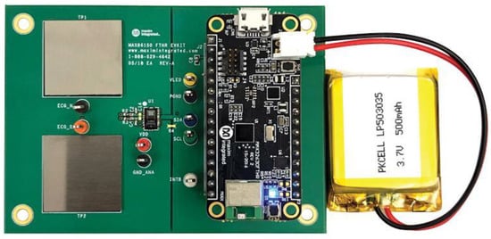 PPG Sensor: A PPG signal is acquired by optically quantifying the variations in blood volume throughout the tissue of the skin, while an electrocardiogram (ECG) sensor may identify the heart’s electrical activity. An outstanding characteristic of this chip is its ability to conduct simultaneous sampling of PPG and ECG signals, leading to synchronized results for both. The board includes the Arduino library and is compatible with all processors equipped with an I2C interface. The device stores the digital output data in a 32-deep First-In, First-Out (FIFO) storage strategy. This device combines the PPG and ECG sensor, pulse oximeter (SPO2), and heart rate sensor modules into a single integrated circuit. A visual illustration of the PPG sensor board is depicted in Figure 3.