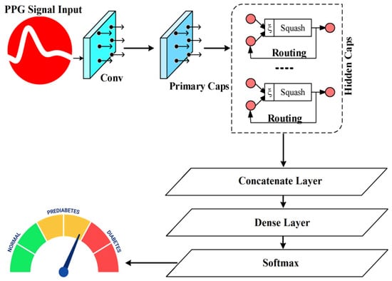 The fundamental objective of the layer is to decrease the dimensionality of the input vector and extract its inherent characteristics. The input vector undergoes conditioning in an original convolution layer to generate a primary CL. The 2nd is the main CL, consisting of 32 filters measuring 9 × 9 × 256 and 8 convolution operations performed in 2 stages. Following the convolution, the data are transformed into 2-dimensional data, with each element being a vector of dimensions 1 × 8. The digital capsule makes up the third layer. The output of the CL is used as input, and the 8-dimensional capsule is converted into a 16-dimensional capsule using the transformation matrix transform methodology. The capsules include a 1-dimensional vector, and every capsule corresponds to a characteristic of a PPG signal. The class discriminant value can be evaluated by comparing the capsule outputs of different dynamic routing algorithms. Subsequently, the input vector that corresponds to the output vector’s direction is identified, while the local features are considered based on the various weights applied to the overall characteristics. This paper presents the calculation procedures for the CL in Equation (24).