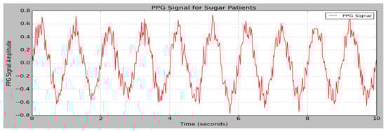 The data obtained from the PPG sensor are provided as input to the research model. The sensor data are partitioned into separate testing and training sets. The performances of the DSCNet method in BGL monitoring are measured based on parameters like MAPE, MAE, MSE, RMSE, MARD, and R2. Figure 6. depicts the PPG signal of sugar patients, and Figure 7 depicts the PPG signals of non-sugar patients.