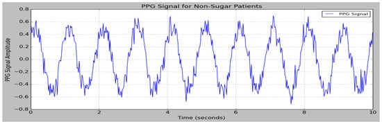 An estimation of blood component levels using the non-invasive model simply requires a bio-signal, such as an image or spectrum. Non-invasive technology has emerged as a more widely used approach in smart healthcare research, effectively addressing the issue. Glucose detection technologies can be categorized into four sub-groups: optical, electrical, thermal, and nanotechnology methodologies. An optical technique refers to all the methods that have been created for operation in the infrared and the optical regions of the spectrum. These approaches use the absorption, reflection, and scattering characteristics of light as it traverses biological media []. PPG is the predominant method for non-invasively measuring blood component levels in present times. The significance of the PPG signal lies in its accessibility through non-invasive and cost-effective sensors. It is a method widely used in medical settings to quantify the saturation level of oxygen (SpO2) in the bloodstream and the pulse rate, which serves as a crucial indicator of the patient’s health. The equipment employed for capturing PPG signals is characterized by its simplicity and affordability. This device comprises two essential components: a light-emitting diode (LED) and a photodiode. The LED functions as a laser or light source (emitter), while the photodiode acts as a light detector (receiver). Photoelectric methods can be used to record PPG signals from the fingers, nasal septum, and toes [].