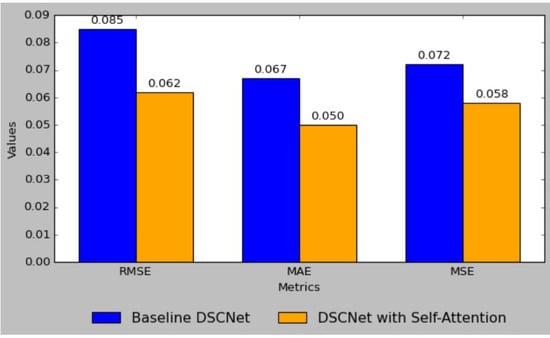 Comparison of RMSE, MAE, and MSE metrics between the baseline DSCNet and DSCNet with self-attention.
