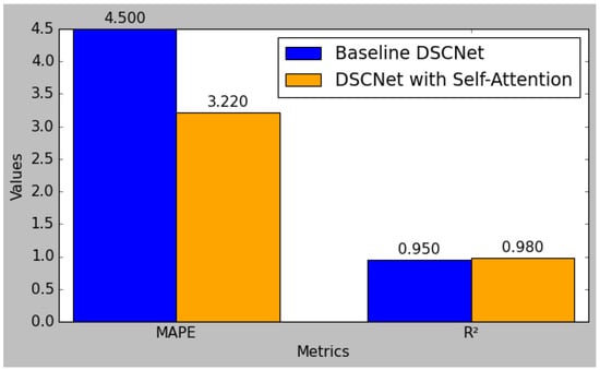 Comparison of MAPE, MAE, and R2 metrics between the baseline DSCNet and DSCNet with self-attention.