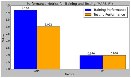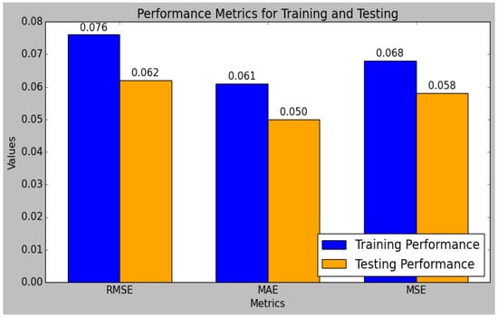 The model achieves a low RMSE of 0.062 and an MSE of 0.058 in testing, which are lower than the training errors, indicating effective generalization to unseen data. Similarly, the MAE and MAPE improve from training to testing, with values of 0.050 and 3.022, respectively, reflecting reduced prediction errors.