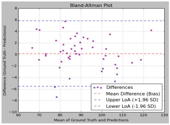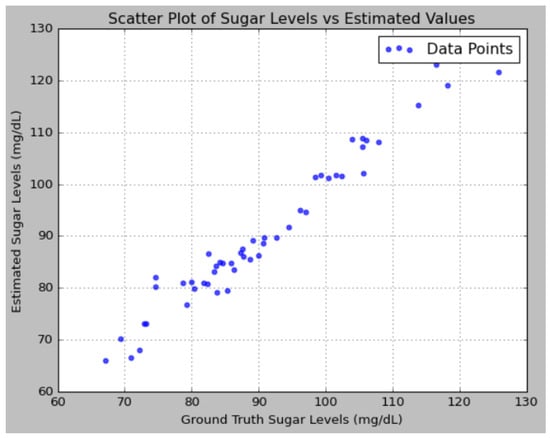 An analysis of the predictions reveals that the proposed model effectively captures the underlying patterns in the sugar level data, as evidenced by the close alignment between the predicted values and the ground truth. The addition of noise to the ground truth data, simulating real-world measurement inaccuracies, allows for a more rigorous evaluation of the model’s robustness. Notably, the model’s predictions were consistently closer to the ground truth compared to the variations introduced by noise, indicating that the model possesses a high degree of accuracy. Figure 12 illustrates the performance analysis using a Bland–Altman plot. Figure 13 depicts the performance analysis of sugar levels vs. estimated values using a scatter plot.