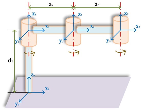 Assuming that the task requirements can be realized in a plane, the system model is simplified when the robotic arm transports the wafer, as shown in Figure 1. Before planning the trajectory, it is necessary to establish the link coordinate system correctly. In general, the points along the Zi axis are aligned with the i-th joint axis. Furthermore, the points along the Xi axis are aligned with a common vertical line. In addition, the Yi axis is oriented according to the right-hand rule. In this study, the parameters of the linkage rods are expressed using the improved Denavit–Hartenberg (DH) method. The parameters of each joint and link are obtained using the link coordinate system as a reference, as shown in Table 1.