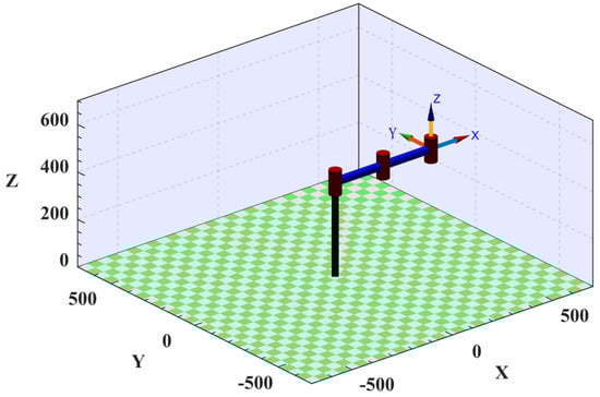 To facilitate the visual analysis of the subsequent trajectory planning and verify the correctness of the simplified model, this study utilizes the MATLAB robot toolbox developed by Peter Corke. It is a powerful robotic simulation and analysis tool that provides a range of capabilities for modeling, simulating, controlling, and visualizing robots. A robotic arm consistent with the simplified model is successfully constructed on the interface by following the building instructions in the MATLAB robot toolbox, as shown in Figure 2.