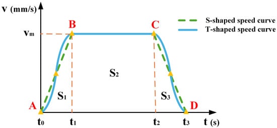 The T-shaped speed curve is a widely used method for robotic arm control. Because of its simplicity and ease of control, it is extremely common in industrial applications. As shown in Figure 3, this curve may produce large impacts and vibrations at points A, B, C, and D, potentially causing the wafer to break. By contrast, the S-shaped speed curve uses nonlinear adjustments to increase and decrease the velocity, making the motion process smoother and effectively solving the discontinuity problem of the acceleration of the T-shaped speed curve. Therefore, the S-shaped speed curve is more suitable in scenarios requiring higher operational stability.
