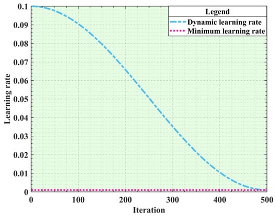 In Equations (12)–(15), the strategy for updating the individual positions is relatively simple. Without considering adjusting the strategy as an iteration progress, the SO algorithm mainly relies on the current individual’s position and velocity vector to determine the next individual’s position. This method is more likely to cause the algorithm to become stuck in a locally optimal solution. To improve the update strategy of the original SO algorithm, this study introduced a cosine learning annealing rate. This strategy simulates the dynamic adjustment of the learning rate based on the cosine function, which can dynamically adjust the speed of the position updating based on the number of iterations. In the early stages of the iteration, the learning rate can be reduced rapidly to achieve fast convergence. In the later stages of the iteration, fine adjustments are made to optimize the precision of the solution by reducing the learning rate, as shown in Figure 7. The specific expression of the cosine learning annealing rate is shown in Equation (18).