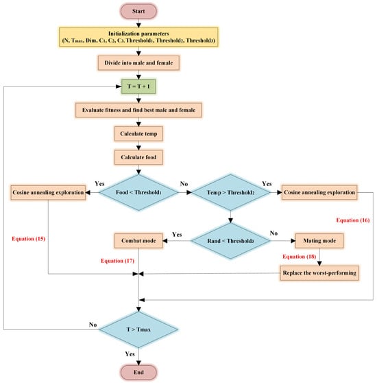 In heuristic algorithms, learning factors play a key role in regulating the search behavior, including the balance between exploration and exploitation. Exploration refers to the ability to search for new solutions randomly, whereas development refers to the ability to search locally for the best solution. The learning factors of the SO algorithm include the constant value C1 of the food calculation equation, constant value C2 of the food exploration stage, and constant value C3 of the food development stage. The initial values of these constants are typically set to C1 = 0.5, C2 = 0.05, and C3 = 2. The equations containing C1, C2, and C3 are Equations (11)–(15). The subscript ‘m’ and ‘f’ refers to the male and female snakes, respectively. The special mention of female snake expressions will be omitted in the following text.