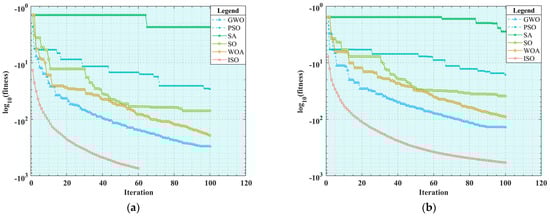 The results of the eight benchmark functions listed in Table 7 are comprehensively analyzed and compared. As shown in Figure 9a–e, it is clearly observed that when the dimension (Dim) is 30, the ISO algorithm achieves an optimal fitness value of 0 for the F1 and F3 problems in the unimodal test function. Its convergence curve can rapidly jump out and continue to decline after falling into the local optimum for a short time. This indicates that the ISO algorithm can effectively escape from a local optimal solution and successfully obtain a global optimal solution. By contrast, to a certain extent, the other five algorithms fall into the local optimum. For the F2 and F4 problems, although the average value of the ISO algorithm is not zero, the variance is zero, indicating that the algorithm can obtain a global optimal solution to some extent. Its average precision is better than that of the second ranked GWO algorithm. In addition, the convergence speed of the ISO algorithm is faster than those of the other algorithms. For the F5 problem, the performances of the ISO algorithm and the other five algorithms are similar, but its overall optimization precision is slightly higher, and the convergence curve is better, without falling into the local optimum too early. Overall, the optimization effect of the ISO algorithm on unimodal functions is significantly better than that of the other five algorithms. Further analyzing Figure 9f–h, when the dimension (Dim) is 30 in the multi-modal test functions, the SO, GWO, WOA, and ISO algorithms can achieve the global optimal value in the F6 and F7 problems with good overall performance, but the ISO algorithm has a faster iteration speed. However, the performance of the six algorithms is not outstanding in the F8 problem, but the average value and variance of the ISO algorithm are the best, with an optimization precision approximately twice that of the other algorithms. In summary, the ISO algorithm demonstrates higher optimization precision in both unimodal and multi-modal functions than the other algorithms. It also improves the avoidance of falling into the local optimum compared to the SO algorithm, showing the expected optimization effect.
