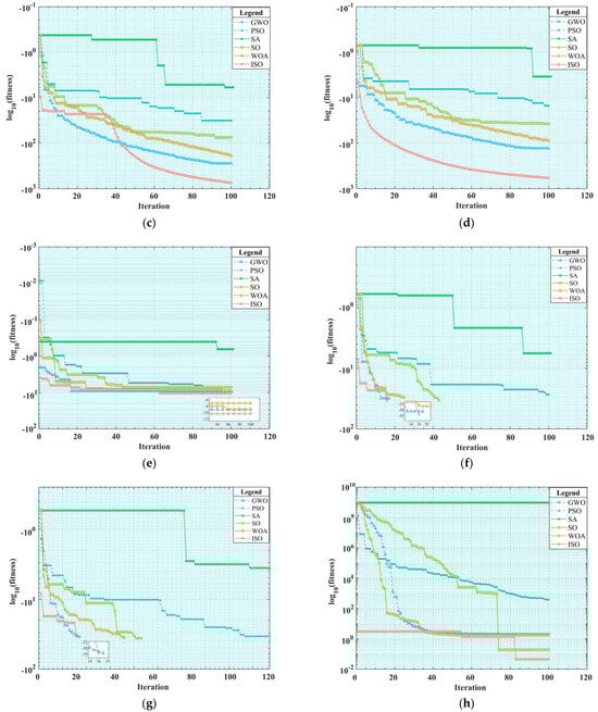Convergence curve of the reference function: (a) F1; (b) F2; (c) F3; (d) F4; (e) F5; (f) F6; (g) F7; (h) F8.
