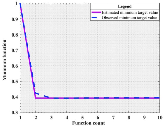 The specific parameter configuration of the simulation experiment can be found in Table 9 for the application of the ISO algorithm to the S-shaped speed curve optimization problem, and the kinematic parameters are set according to Industrial Robot ISO 9283:1998. In the simulation experiments, amax and jmax are set as independent variables and their upper bound (ub) and lower bound (lb) are between 80 and 120. In the SO algorithm, the empirical values of threshold parameters threshold1, threshold2, and threshold3 are 0.25, 0.6, and 0.6, respectively. To determine more reasonable parameter combinations, the ranges of these thresholds are unified and adjusted. The range of threshold1 is limited to 0.05 to 0.45, while the ranges of threshold2 and threshold3 are adjusted to 0.4 to 0.8. Correspondingly, the search range of the threshold parameter (Bayesian threshold) in the Bayesian optimization process is also set to 0.05 to 0.8 to facilitate determining the optimal parameter configuration. The other parameters have the same meanings as those described earlier. The Bayesian optimization threshold simulation results are shown in Table 10, which includes the iteration, the actual observed objective value of the current iteration, the best observed value among all observations (BestSoFar_observed), the model-predicted best value (BestSoFar_estimated), and the best thresholds combination obtained in this generation. However, because there are not enough data to support the construction of the first-generation model of Bayesian optimization, Objective, BestSoFar_estimated, and BestSoFar_observed are not included in the calculation. In addition, a simulation diagram of the minimum objective value and function calculation times corresponding to Bayesian optimization is shown in Figure 10, where the initial value of the first generation is replaced by number 1. For the dual-objective optimization problem considered in this study, the distribution of the Pareto frontier is generally in the form of a curve, which is intuitively shown in Figure 11.