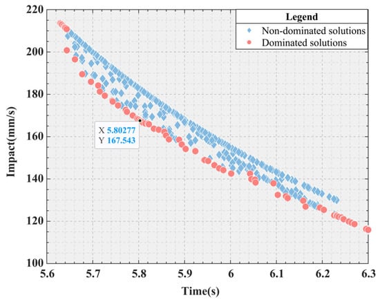 According to the data provided in Table 10, Bayesian optimization is used to select the second-generation simulation results with the minimum objective function value. This selection is based on minimization of the target value during the iteration. Figure 10. clearly shows the dynamic change in the target value with the iteration, making the change process clear. Further analysis of Figure 11, the minimum values of F1 and F2, respectively, reach 5.6294 s and 115.937 mm/s. And the two minimum values are, respectively, located at the two ends of the Pareto frontier composed of the red dots. To optimize both the time and impact, an optimal advantage must be found on the Pareto frontier. A specific point is identified in Figure 11, which achieves an optimal balance between the time and impact. When amax and jmax are 78.1476 mm/s2 and 119.8756 mm/s3, the time and impact of the Pareto optimal value are 5.8028 s and 167.5427 mm/s, respectively.