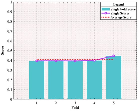 To verify the performance of Bayesian optimization in optimizing the parameters of the objective function, a 5-fold cross-validation method was adopted in this study. The experimental results are shown in Figure 12. It can be clearly seen that the performance of this model during the 5-fold cross-validation process is relatively stable, with a small fluctuation range of the Single Scores, which fully indicates that the model has a certain fitting ability. Generally speaking, a cross-validation score within 0.2 can be regarded as excellent, and a score between 0.2 and 0.5 indicates average performance. The average score of this experiment is approximately 0.4, which indicates that the model has a certain predictive ability on this dataset as a whole, but there is still room for improvement.
