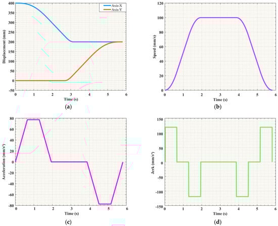 Using the computed amax and jmax, these data are reintegrated into the trajectory planning of the S-shaped speed curve. Through this process, it is possible to accurately determine the partial displacement of the trajectory planning in the directions of the X-axis and Y-axis, as well as the associated combined velocities, combined accelerations, and combined accelerations, as shown in Figure 13. These figures clearly show that the planned S-shaped speed curve exhibited smooth characteristics during movement, effectively avoiding sudden changes and shocks. This is extremely important for precision operations such as wafer handling, as it helps reduce the damage that can be caused by impact.