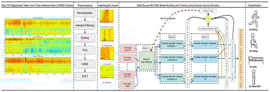 In this paper, we attempt for the first time to apply multi-source domain adaptation to an unsupervised model using Wi-Fi-based CSI data for cross-domain applications. Given the fact that domain shifting has the extra burden of generating, migrating, and annotating sufficient data, we take advantage of multiple scarce source domains to map their feature spaces to a target domain. Most of the public CSI datasets are collected in such a way that they cannot be used for cross-domain applications due to limited data samples per domain (particular user/environment or a specific day of the week). However, the proposed model overcomes the problem by successfully leveraging the data from diverse domains and aligning the distributions related to each specific source domain with a target domain. In addition, we train domain-specific classifiers by using domain-invariant representations acquired from diverse source domains. When these trained classifiers are used to predict target classes, they might classify them differently due to distribution mismatch near the decision boundaries. Ultimately, we align the decision boundaries of each classifier for the target domain. Figure 1 illustrates the workflow of our proposed methodology, detailing the process from collecting raw CSI measurements to classifying the activities being performed. (1) We first extract the raw CSI magnitude values. (2) We normalize them to a scale of [0–255] RGB scale. (3) We apply PCA for selecting features with maximum variation. (4) We use t-SNE embedding to find local relationships within high-dimensional data by projecting them into a lower-dimensional space. (5) Spectrograms are generated leveraging STFT and are fed to the model as input. (6) The model use such spectrograms generated from diverse sources and transforms the model to adopt a new target domain. (7) Finally, after being optimized, the model classifies activities on this new domain.