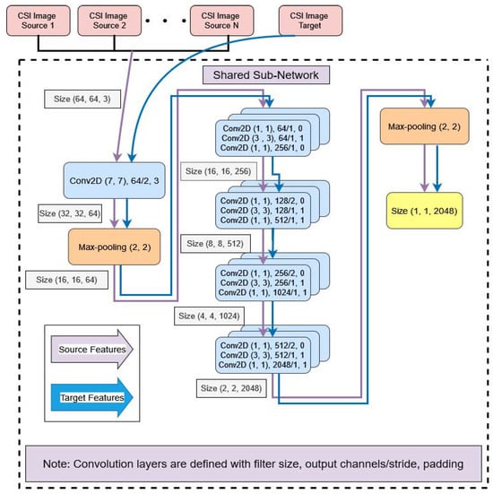 The first part of our proposed architecture is a common feature extractor. This sub-network is a shared framework for N mutually distinct source domains and an unseen target domain different in features from any of the source distributions. It helps the model to map common domain-invariant features from their original feature spaces into a common feature space. Suppose we have a batch of L samples belonging to the source domain and a batch of L samples belongs to the target domain. After passing through the common feature extractor with the mapping parameter , they get transformed into and . However, it would take a long time for the sub-network to converge on a common feature space from a diverse range of source distributions. Therefore, we utilize the resources of transfer learning with the help of a pre-trained convolution neural network (CNN) model. The sub-network training starts with the fine-tuning of a ResNet50 [] architecture pre-trained on the ImageNet 2012 dataset. We follow the fine-tuning steps explained by the study of []. ImageNet 2012, a part of the ImageNet project [], contains 1000 classes of images including animals, everyday objects, tools, etc. A ResNet50 architecture pre-trained on 1.2 million such images belonging to the family of the ImageNet project is the shared sub-network for all the source and target domains. We further fine-tune the sub-model weights with the diverse multi-domain sources and target domain data samples to make the feature vectors of all the domains as similar as possible and minimize domain discrepancy. The input to the ResNet50 sub-network is 3D CSI pseudo-color map images/spectrograms of size (height, width, RGB channels). Figure 2 shows the architectural details of ResNet50 for fine-tuning the shared sub-network weights.