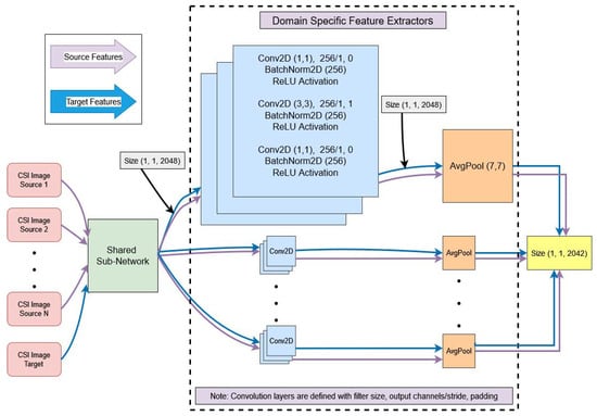 As mentioned earlier, it is not always possible for an adversarially trained model to significantly extract similar data features from various dissimilar source distributions. In order to tackle this problem, we further feed common domain-invariant representations received from the previous Stage 1 of the shared sub-network into N unshared CNN-based domain-specific feature extractors in a group of batches. Each domain-specific feature extractor is utilized to map a pair of source and target domains into a specific feature space by producing the target representations in support of the paired source domain. Suppose is the domain-specific feature extractor mapping function with a mapping parameter introduced with the source- and target-generated common data features and , respectively. The domain-specific feature extractor produces the domain-specific feature spaces such that and . To achieve this goal, we test several statistical methods to minimize the distance between two probability distributions so that they can be correlated to each other as similarly as possible. We evaluated the strength of three well-known domain discrepancy reduction techniques in our device-free cross-domain HAR, namely maximum mean discrepancy (MMD) [], multiple-kernel maximum mean discrepancy (MK-MMD) [,], and joint maximum mean discrepancy (JMMD) []. Finally, we choose the best one in terms of its suitability for the specific HAR application. We add these distance minimization losses to the backpropagation loss of the classifier output, which is the third stage of the proposed architecture. Figure 3 depicts the architectural details of domain-specific feature extractors connected with the Stage 1 shared sub-network, illustrated in Figure 2.