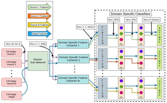 Prior research work in the field of device-free sensing is mainly focused on adversarial models trained on a multi-source combined data features to extract domain-invariant representations of all domains and map them onto a new target domain for matching cross-domains with inconsistency problems [,,]. At first, it is difficult for an adversarial model to efficiently extract domain-invariant features coming from a diverse range of source domains, and one-on-one mapping of these domains in a common feature space aligned with the target domain is also not convenient. This leads to poor recognition accuracy in many domain shifting tasks. Researchers also employed pre-trained models for transforming domains in device-free HAR in order to minimize the computational cost and training time and also to deal with the training data scarcity issues. However, transfer learning-based approaches are not very effective in reducing the training data proportions, as investigated by the work of []. They achieved comparable results to the adversarial models with 500 training data samples using a pre-trained roaming model that was already trained between environments A and B in order to learn quickly between environments A and C. Again, common feature extraction from multiple source domains is not easier using transfer learning-based approaches, especially when the training data samples of a new domain are very limited. Therefore, our proposed model is a combination of a shared pre-trained model connected with many adversarially trained domain-specific sub-networks. The first stage uses the benefits of transfer learning to extract domain-invariant representations of different pairings of multiple sources with a target domain. The second stage uses domain adaptation techniques to align each pair of source and target domains into specific feature spaces and match their distributions. To the best of our knowledge, this is the first attempt to test multi-source domain adaptation with a transfer learning-based method to assess the domain inconsistency problem in human activity classification using device-free sensing.