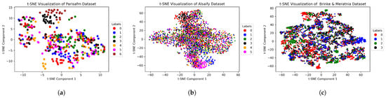t-SNE plots for the selected datasets. The activity labels are shown in Table 1. (a) t-SNE visualization of the Parisafm dataset. (b) t-SNE visualization of the Alsaify dataset. (c) t-SNE visualization of the Brinke and Meratnia dataset.