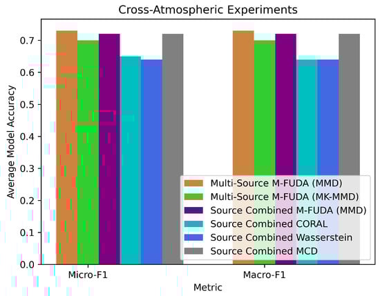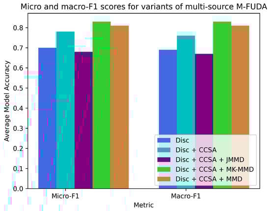 where H is the reproducing kernel Hilbert space (RKHS). When the kernel function used in MMD is changed to a multi-kernel function , it helps to leverage the strengths of multiple kernels to adapt to complex differences between source and target distributions. These kernels are useful for extracting features from different aspects of data using a balancing factor that decides the contribution of each aspect to the overall alignment of two distributions to achieve better adaptation. Such an alignment technique is called multiple-kernel maximum mean discrepancy (MK-MMD) [,]. Mathematically, a multi-kernel function is defined as
