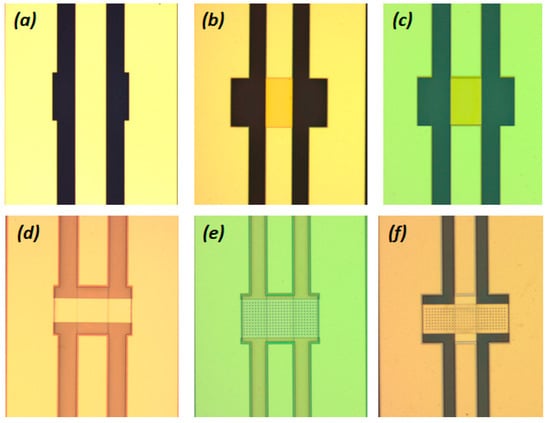 Optical microscope images showing the device at the various processes steps namely (a) deposition of the CPW lines, (b) patterning of the dielectric films, (c) deposition of the sacrificial layer, (d) deposition of the seed layer, (e) patterning the shape for the electroplating process step and (f) final devices after the bridge release. The devices presented above are having G/S/G (i) 65/110/65, (ii) 85/140/85 and 96/160/96 (in μm), bridge widths w1 = 125 μm, w2 = 150 μm, w3 = 175 μm and w4 = 200 μm, bridge length l = 450 μm and l = 500 μm, thicknesses t = 2.3 μm and t = 2.7 μm and holes with side dimension = 5 μm and = 10 μm.