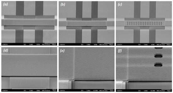 SEM micrographs showing the devices having (a) bridges without holes (FB), (b) bridges designed with holes side size = 5 μm (H1) (c) and = 10 μm (H2). The high-angle imaging (d–f) revealed that the bridges indeed remained suspended after the standard wet release process.