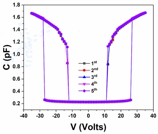 Then selected devices from all the possible variations (though this study focused solely on RF MEMS fabricated on 65/110/65 (μm) CPW lines) were characterized electrically by performing on wafer capacitance-voltage (C-V) measurements with a small signal set at 1 MHz, using an LCR meter that provided also the DC bias voltage. All devices were functional and the Figure 3 presents a typical and representative response obtained on the RF MEMS capacitive switches. These devices clearly showed the ability to pull-in and pull-out effectively and to operate consistently. At this point it should be mentioned that the RF MEMSs were fabricated on a glass substate to avoid possible contribution from the Metal-Oxide-Semiconductor capacitor formed in the cases where Silicon substrate is utilized [].