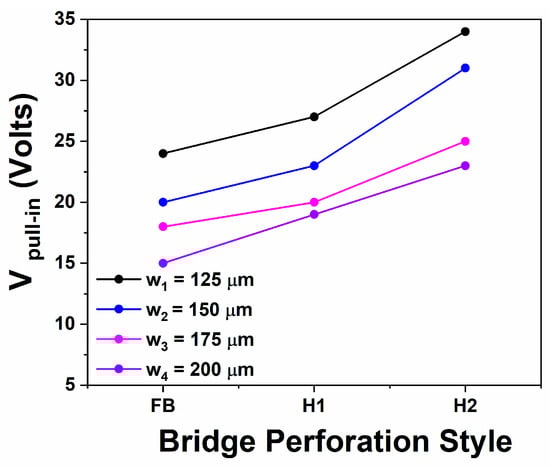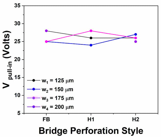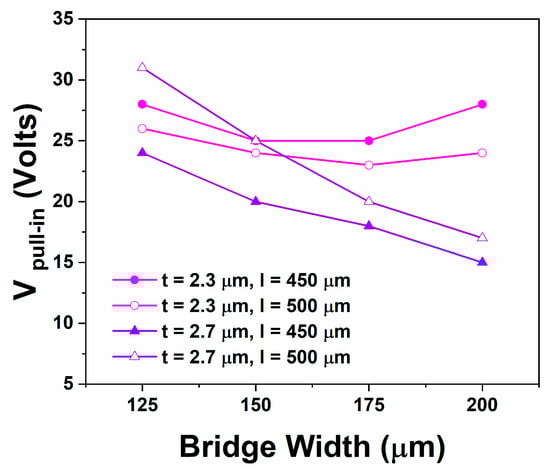 Bearing these in mind, the initial discussion in this paragraph is focusing on the devices having bridges without any hole perforation referred to as “Full Bridge” (FB) in this work. These devices allow an assessment directly by the Equations (1)–(3). Figure 5 presents the experimental monitoring of the first pull-in, defined here for this comparison as the highest value of the applied voltage before the device first actuation, always performed with acquisitions towards positive biases. The results include for both bridge thicknesses mentioned above (2.3 μm and 2.7 μm), two variations in the bridge length (l = 450 μm and l = 500 μm) and four variations in the bridge width (w1 = 125 μm, w2 = 150 μm, w3 = 175 μm and w4 = 200 μm).