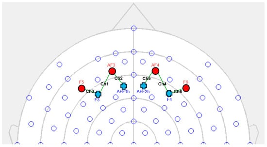 Using a six-channel optodes matrix from the NIRScout System (NIRx Medical Technologies, LLC, Los Angeles, CA, USA), the variations in the concentrations of oxygenated hemoglobin (O2Hb) and deoxygenated hemoglobin (HHb) were measured. Four light sources/emitters and four detectors were positioned on the scalp using an fNIRS cap, following the 10/5 international standard []. The emitter–detector distance between consecutive optodes was set to 30 mm, utilizing two wavelengths of near-infrared light (760 and 850 nm). A probabilistic atlas available in the fOLD software (fNIRS Optodes’ Location Decider, version 2.2.1) [] was used for the positioning of the sources, detectors, and spacing between them, ensuring alignment with the underlying functional regions and the most relevant Brodmann areas [,]. The analysis concentrated on the frontal brain regions, particularly the prefrontal cortex (PFC) to explore its activity during the persuasion process (Figure 2).