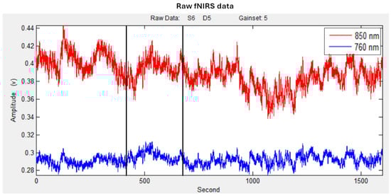 The raw time-series data (see Figure 3) were visually inspected subject by subject during both the experimental phase and signal processing to detect noisy channels caused by motion artifacts or amplitude fluctuations. Channels with poor optical coupling or lacking ~1 Hz heartbeat oscillations were excluded from the analysis []. A linear-phase Finite Impulse Response (FIR) filter (0.3 Hz) was applied to account for respiration, ensuring a symmetric impulse response [,].