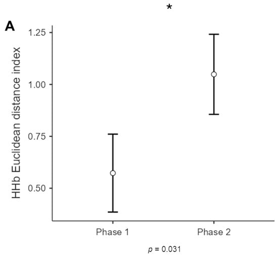 For HHb, a significant main effect for phase [F(1,11) = 6.070, p = 0.031, η2= 0.062)] was found, with increased dissimilarity (greater Euclidean distance) for phase 2 compared to phase 1 (Figure 4).