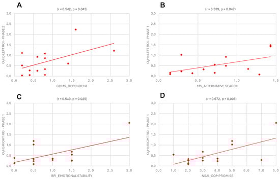 For O2Hb in the left and right hemispheres during Phase 1 and Phase 2 with GDMS, MS, and 10-item BFI, the results revealed a positive correlation between GDMS-dependent style and the left ROI in Phase 2 (r = 0.542, p = 0.045), a positive correlation between MS alternative search and the left ROI in Phase 1 (r = 0.539, p = 0.047), a positive correlation between BFI emotional stability and the right ROI in Phase 1 (r = 0.549, p = 0.025), and a positive correlation between NSAI compromise and the right ROI in Phase 1 (r = 0.672, p = 0.008) (Figure 5A–D).