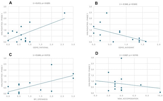 For HHb in the left and right hemispheres during Phase 1 and Phase 2 with GDMS, MS, and 10-item BFI, the results revealed a positive correlation between the GDMS rational style and the right ROI in Phase 1 (r = 0.612, p = 0.020), a negative correlation between the GDMS avoidant style and the right ROI in Phase 1 (r = −0.548, p = 0.043), a positive correlation between BFI openness and the right ROI in Phase 1 (r = 0.646, p = 0.013), and a negative correlation between NSAI accommodation and the right ROI in Phase 2 (r = −0.621, p = 0.018) (Figure 6A–D).